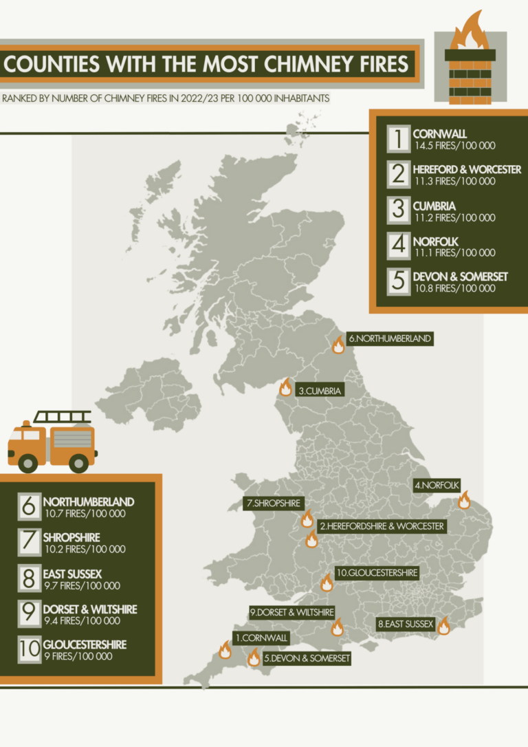 To discover more about chimney fires in the UK, we analysed statistics released by the fire services and identified the counties more at risk.